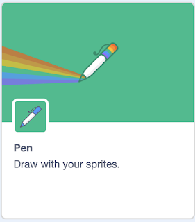 On this project students will need to add the "Pen" code pallete in Scratch. At the bottom of the Code Blocks section there is a button to access the additional code blocks. It looks like this: